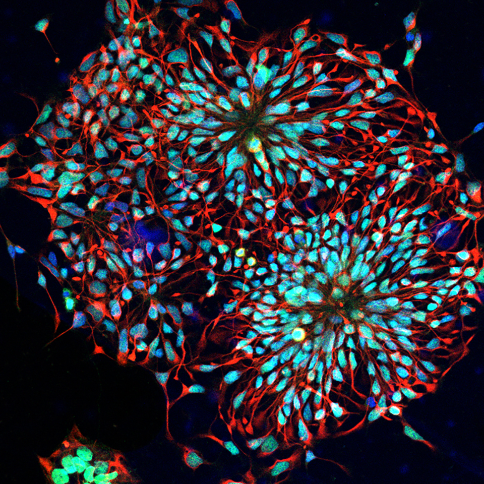 圖中顯示出兩朵盛開的“花”,為人胚胎幹細胞體外神經誘導得到的神經幹細胞,也是我們俗稱的“神經花環”。這是我們通過免疫熒光檢測神經幹細胞特異性標記物PAX6(綠色)和NESTIN(紅色)得到的共聚焦圖片,藍色為細胞核顏色(DAPI),該照片攝於2021年1月。