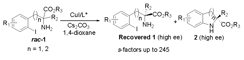 在CuI/(R)-BINOL衍生的配體作用下,消旋的2-氨基-3-(2-碘代芳基)丙酸酯以及2-氨基-4-(2-碘代芳基)-丁酸酯化合物的動力學拆分反應高光學選擇性的生成分子內N-芳基化產物並回收光學富集的原料,反應的選擇因子高達245。這一反應為不對稱N-芳基化反應提供了新的有效方法。
