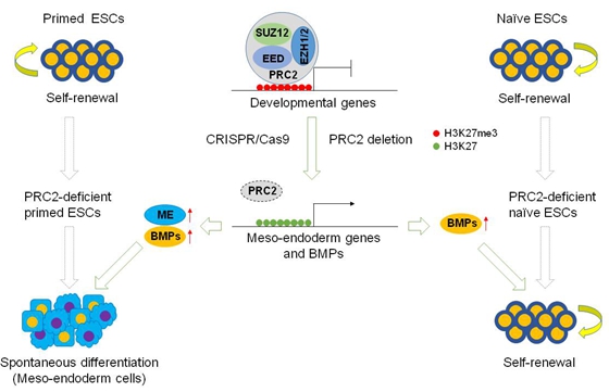 課題組通過構建可誘導性敲除PRC2的人胚胎幹細胞,確認BMPs蛋白激活是PRC2缺失引起人胚胎幹細胞自發分化的原因。課題組進一步展示缺失PRC2的小鼠胚胎幹細胞可以維持自我更新狀態,但轉變成始發狀態的小鼠上胚層幹細胞發生自發分化;將人胚胎幹細胞轉變成幼稚態時,發現缺失PRC2可以維持其多能性狀態。以上結果揭示PRC2在細胞命運決定過程中譜係特化和不同多能性狀態的特異性作用,對人胚胎幹細胞是否能向整個外胚層譜係分化起決定作用,並在維持naive(幼稚態)和primed(始發態)兩種狀態的胚胎幹細胞多能性發揮不同作用。