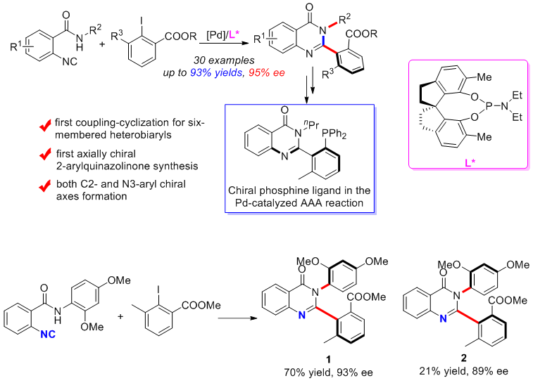鈀催化2-異腈苯甲酰胺的不對稱偶聯—環化反應構建軸手性的2-芳基-和2,3-二芳基喹唑啉酮