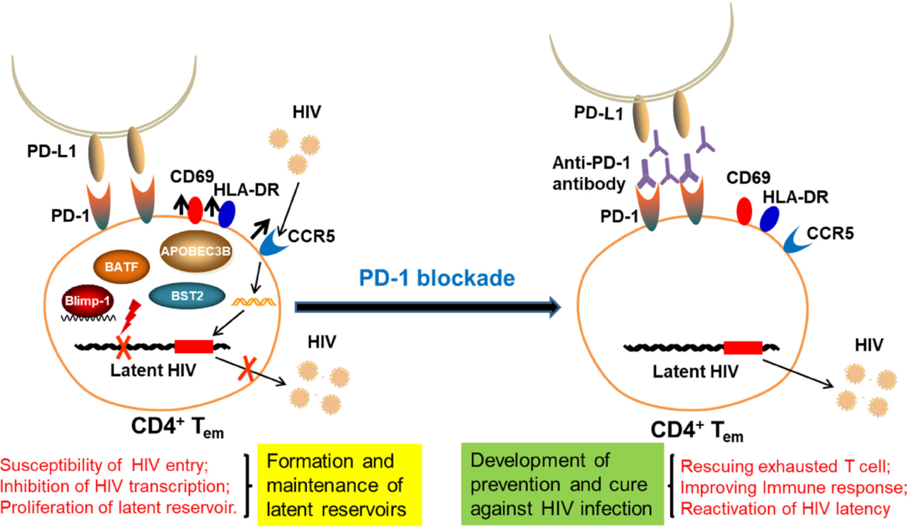尋找潛伏感染艾滋病毒儲存庫的分子標記是實現艾滋病功能治愈的關鍵。研究者發現表達PD-1的CD4+ T細胞有利於艾滋病毒入侵並具有利於儲存庫形成的特性,進一步證實艾滋前病毒基因組在這群細胞中顯著富集,體外PD-1抗體可以激活HIV病毒儲存庫。重要的是,SIV慢性感染獼猴在接受了ART和PD-1抗體治療後,能夠提高獼猴的艾滋特異性免疫應答,但在PD-1治療期間中斷ART治療後,病毒載量速度反彈至峰值,加重了艾滋疾病的進展。
