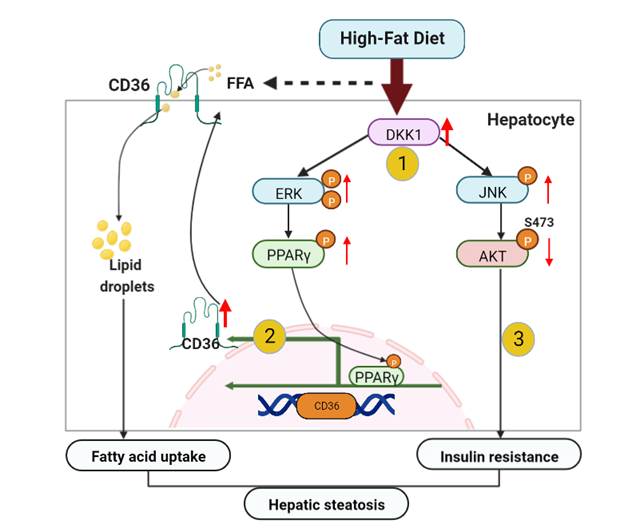 近日,betway体育下载 李尹雄研究員課題組在Life Science Alliance上發表了題為Hepatic DKK1 driven steatosis is CD36-dependent的研究論文。這項研究闡明了高脂飲食誘導肝內DKK1升高進而促進肝脂肪變性的病理基礎。 DKK1通過ERK-PPARγ軸上調CD36增加脂肪酸攝取,通過上調JNK信號加劇肝胰島素拮抗,兩者的疊加是DKK1驅動脂肪肝的關鍵事件。