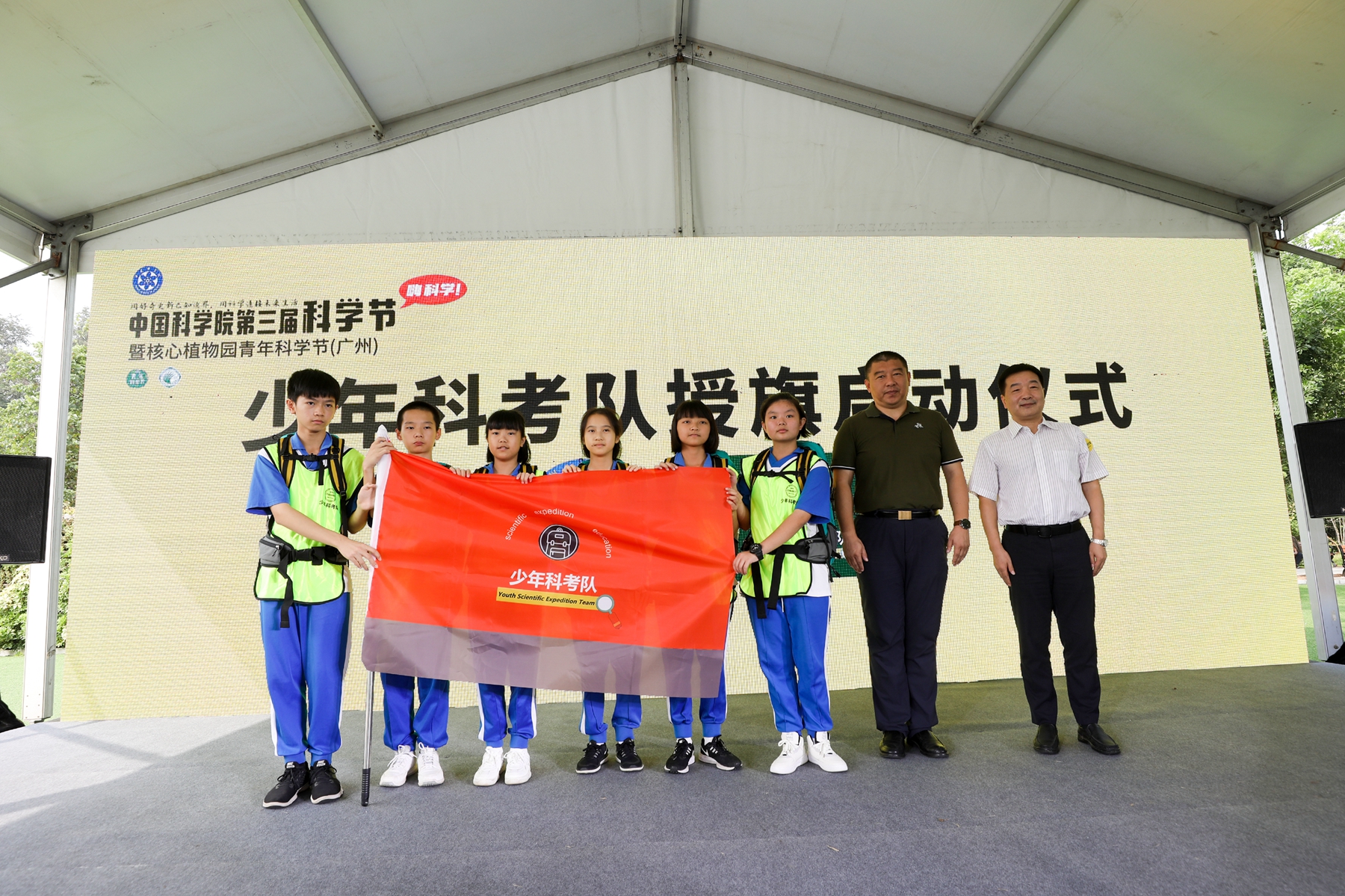 以“嗨,科學!”為主題的中國科學院第三屆科學節從10月31日持續到11月6日。在中科院廣州分院的大力支持下,廣州健康院聯合有關單位成立少年科考隊,推動實施“高端科研資源科普化”。在科學節啟動儀式現場,侯紅明將少年科考隊的旗幟授給了廣州科學城中學校長薑慶新。