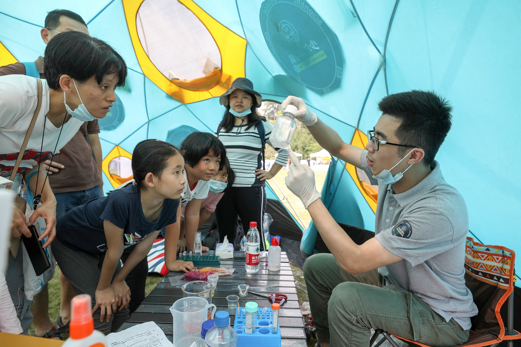 在科學節現場的球形帳篷裏,不僅有戶外體驗,還有有趣的科學實驗。提取動植物DNA,聽起來是多麼“高大上”的科研工作。在科學節現場,廣州健康院的科研人員別出心裁,教公眾提取草莓DNA,帶領公眾體驗了一把當科學家的樂趣。