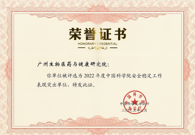 廣州健康院獲“中國科學院2022年度安全穩定工作突出單位”稱號