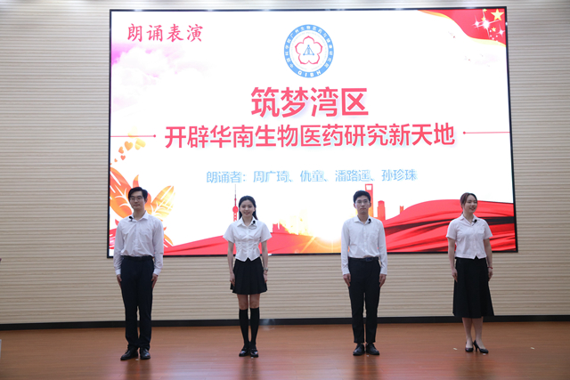 今年是廣州健康院建院20周年,在讀研究生周廣琦、仇童、潘路遙、孫珍珠四位同學獻上朗誦表演《築夢灣區,開辟華南生物醫藥研究新天地》,展現了廣州健康院人不忘初心,砥礪奮進,努力實現高水平科技自強自立的成長曆程和決心。